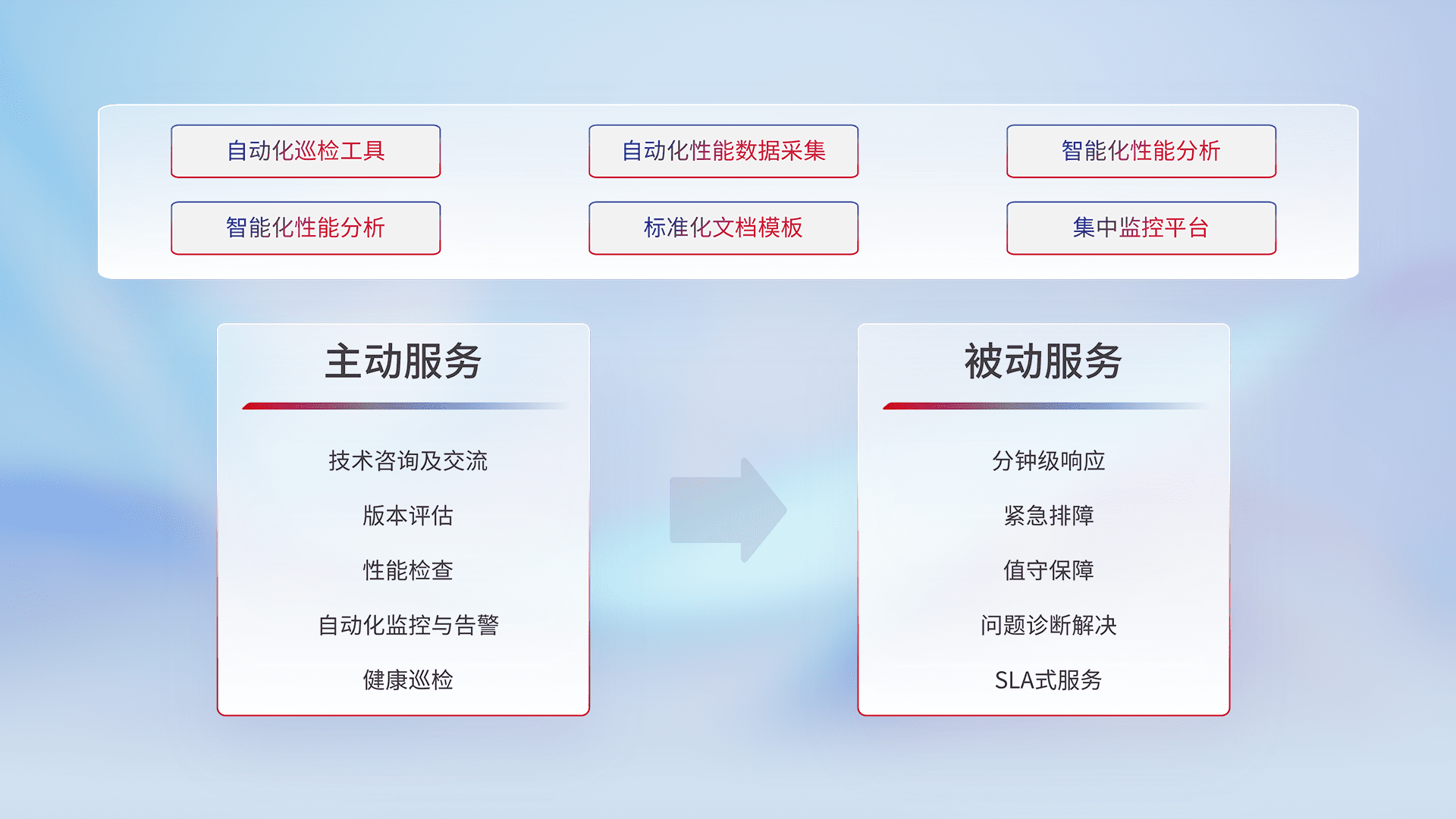 智能化工具和标准化文档,,,保障服务质量,,提供主动服务(包含技术咨询、、版本评估、、、性能检查、、、自动化监控与告警、、、、健康巡检)和被动服务包含(分钟级响应、、、紧急排障、、、、值守保障、、问题诊断解决、、、SLA服务)。。。。